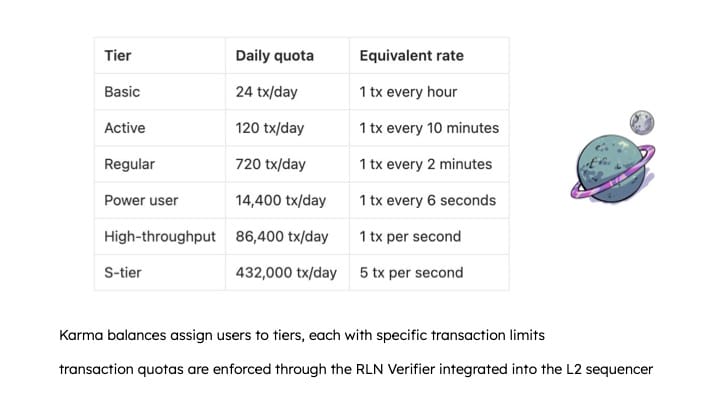 Specifically, Status Network will support six tiers of users (from Basic to S-tier) through its Karma system, each with a tiered transaction limit ranging from one transaction per hour to five transactions per second. This entirely new approach completely changes the existing economic incentive structure of L2 blockchains, determining network accessibility based on users' reputation and contributions.