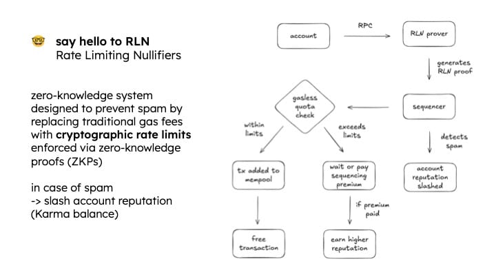 As a solution, Status Network introduces an innovative anti-spam system called RLN (Rate Limiting Nullifiers) that replaces gas fees with a reputation system, enforcing cryptographic rate limits through zero-knowledge proofs.